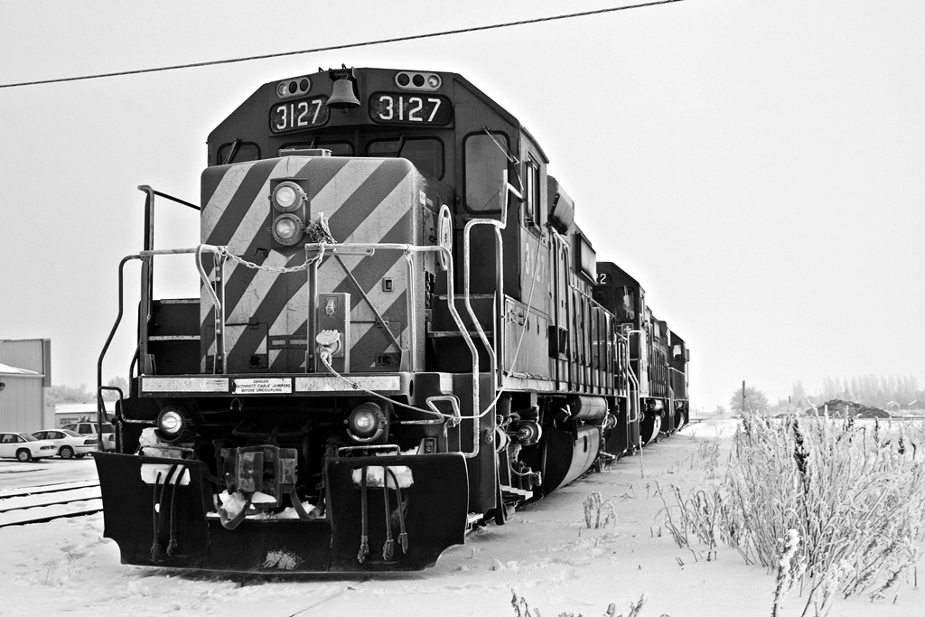 Caption: A frozen CP 3127 parked waiting for the crew to get out of a nice warm van and onto the frosty gm products.