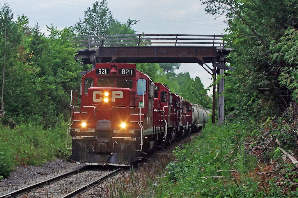 Caption: 8211 heads up todays T07 along with 3114 3045 3133 with a load of 31 cars.Heading deep into the woods at Tapley Ontario.