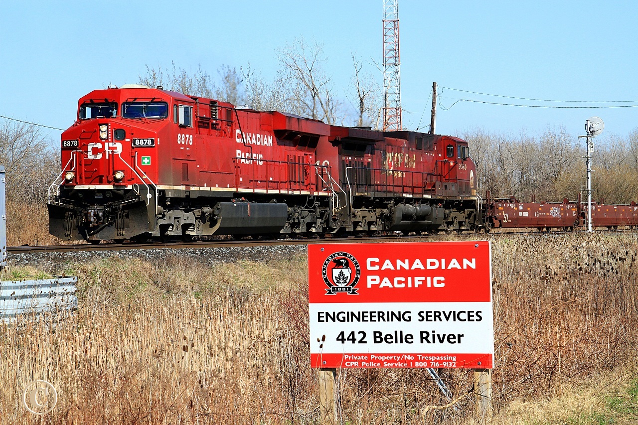 Caption: Leaving the siding at mile 94.1 on the CP's Windsor Sub in Belle River, CP 8878 and CP 9540 with train 241 head for the U.S. border.