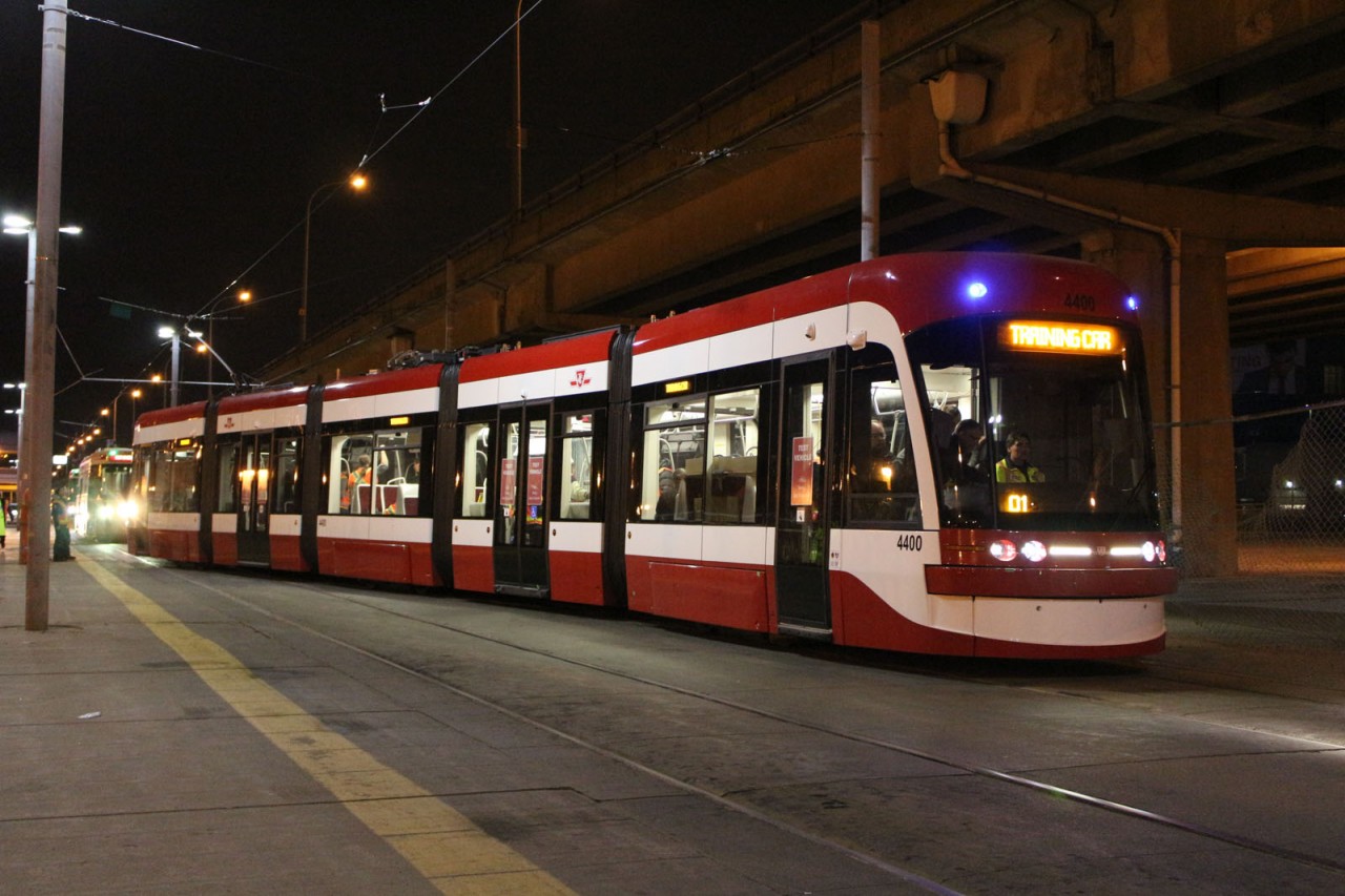TTC's newest streetcar, 4400, snakes through the crossovers at Exhibition Loop during a test run. This would be only its second trip out onto public streets, with all previous testing taking place at Hillcrest Complex.