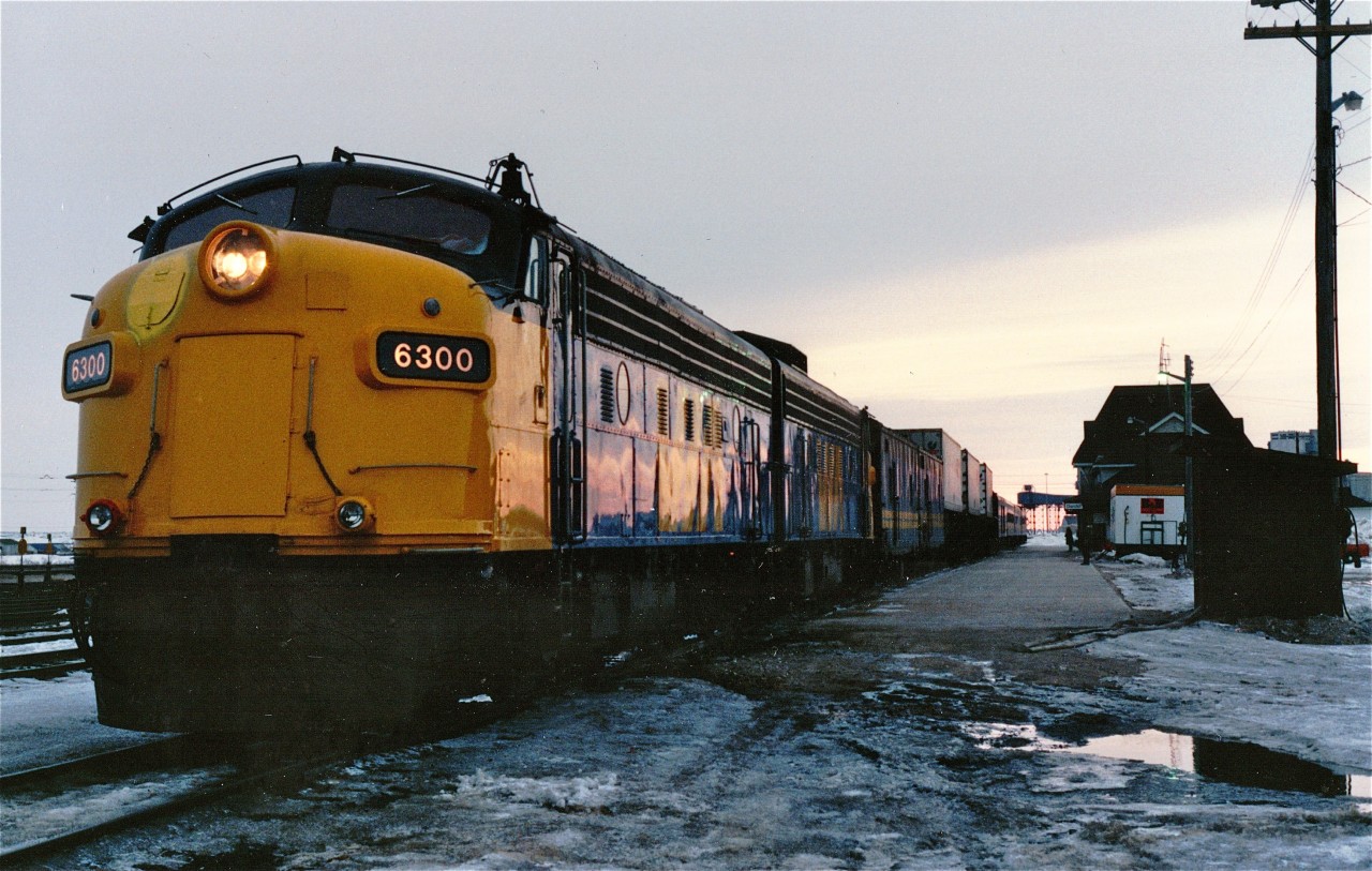 Caption: VIA Rail FP9A 6300 awaits the 9 pm departure on a Saturday evening late in April 1990 of #92 for Winnipeg, 1000 miles and 35 hours to the south. Trailing 6300 is another FP9A, two steam generators, three flat cars each equipped with steam pass-through lines and each carrying a highway trailer, one baggage car, one coach, one dining car and one E-class sleeping car. 6300, which was badly damaged in the 1986 Hinton collision, ended its working days as the shop switcher at VIA's Vancouver Maintenance Centre. It is now in the possession of the BC Chapter of the National Railway Historical Association, in New Westminster, BC.