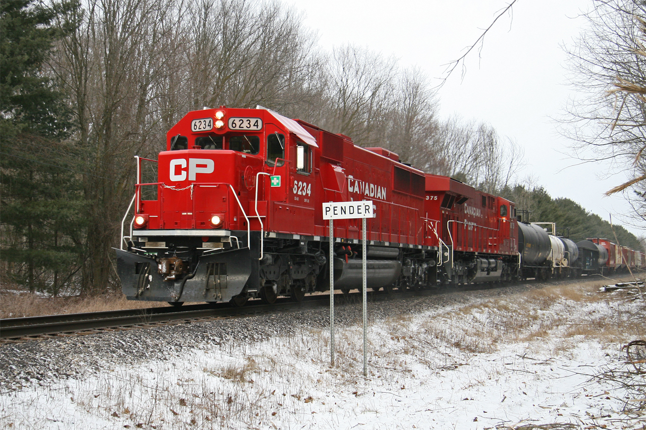 Caption: A clean CP 6234 is westbound on CP train 235 one mile west of Pender on the Galt Sub. They will set off 47 multies at W. Coke before continuing west to London.