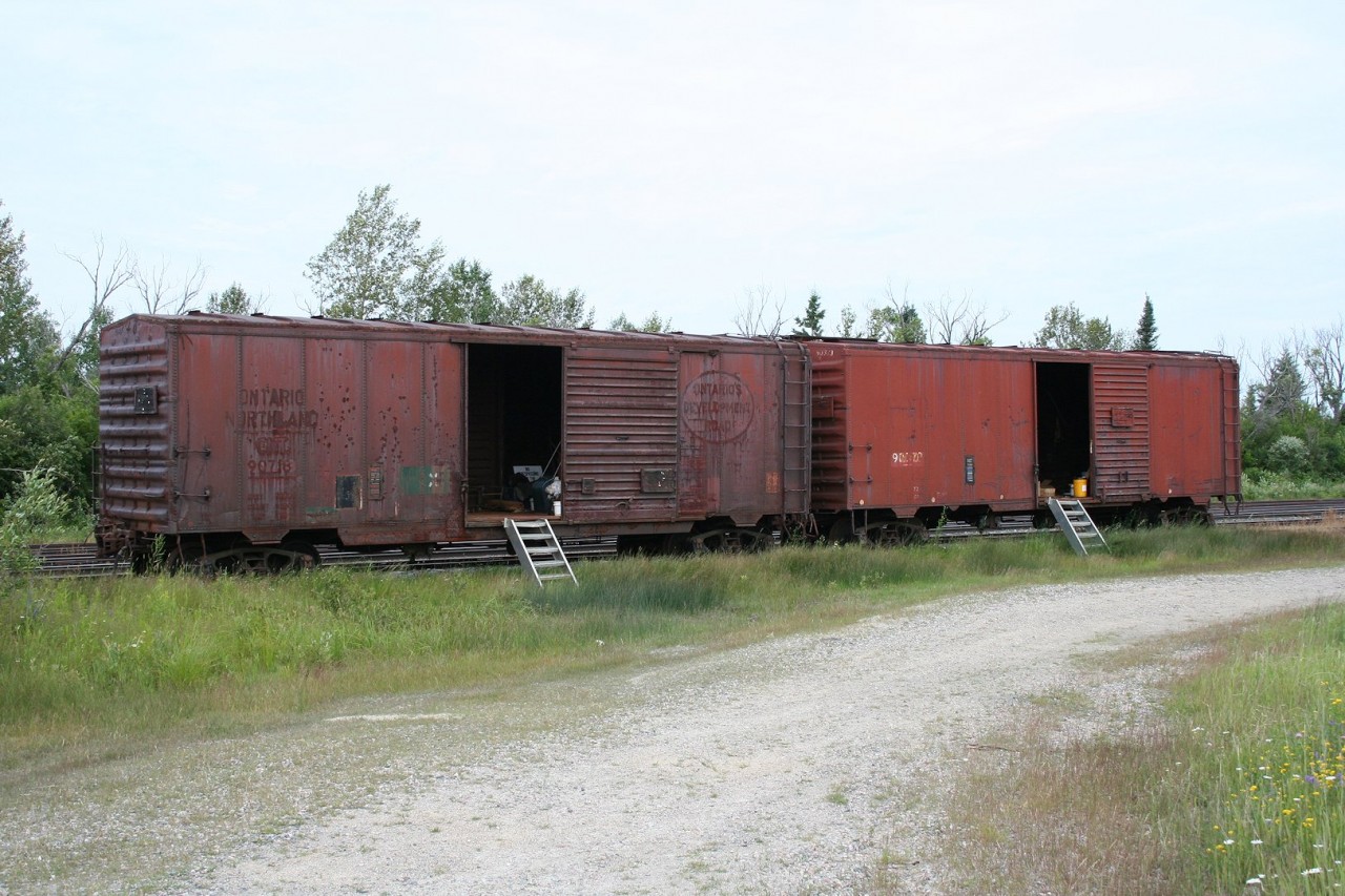 This pair of material storage cars were parked in the small yard at Porquis, the junction point where the lines to Timmins and Iroquois Falls diverge from the line up to Cochrane.