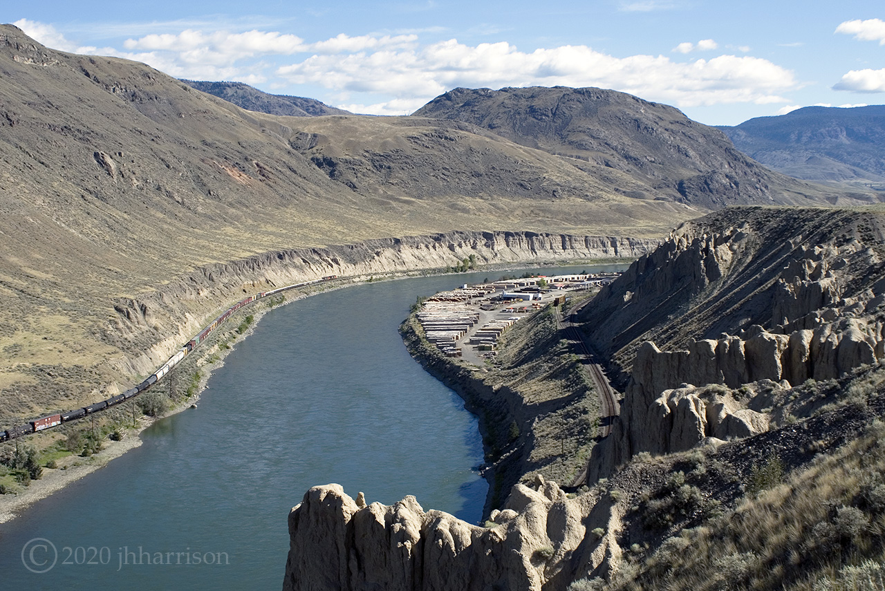 Caption: An eastbound CN on CNs Ashcroft Sub is passing Koppers Ashcroft Inc. Previously, the Ashcroft Treatment Plant, owned by Tolko, it was purchased by Koppers in 2014. The plant produces railway ties, bridge timbers and crossing planks. Evans Rd. ends at the plants entrance.