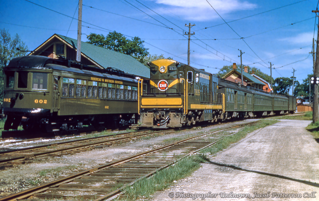 This picture is a gem ! Was fortunate enough to have ridden the M&SC to Marieville, Que. on a sister interurban car of 602. Note the matching “CNR green” on the CLC 7615, the cars it is towing and M&SC interurban 602. Unlike the other CNR owned interurban railway, the NS&T, the M&SC cars did not show any CNR marking other than the green colour. Car 602, which appears to have had recent paint job, is parked (both poles down) awaiting for a return trip to McGill Street Terminal in downtown Montreal. When this picture was taken, there was dismay among the traction enthusiasts that interurban car car operation to Granby had been cut back to Marieville, but at least the replacement passenger train has interesting diesel power. Note the express box car on the tail end of train 705 in CNR passenger green. Thank you Jacob for sharing this picture and the very interesting and informative caption, John