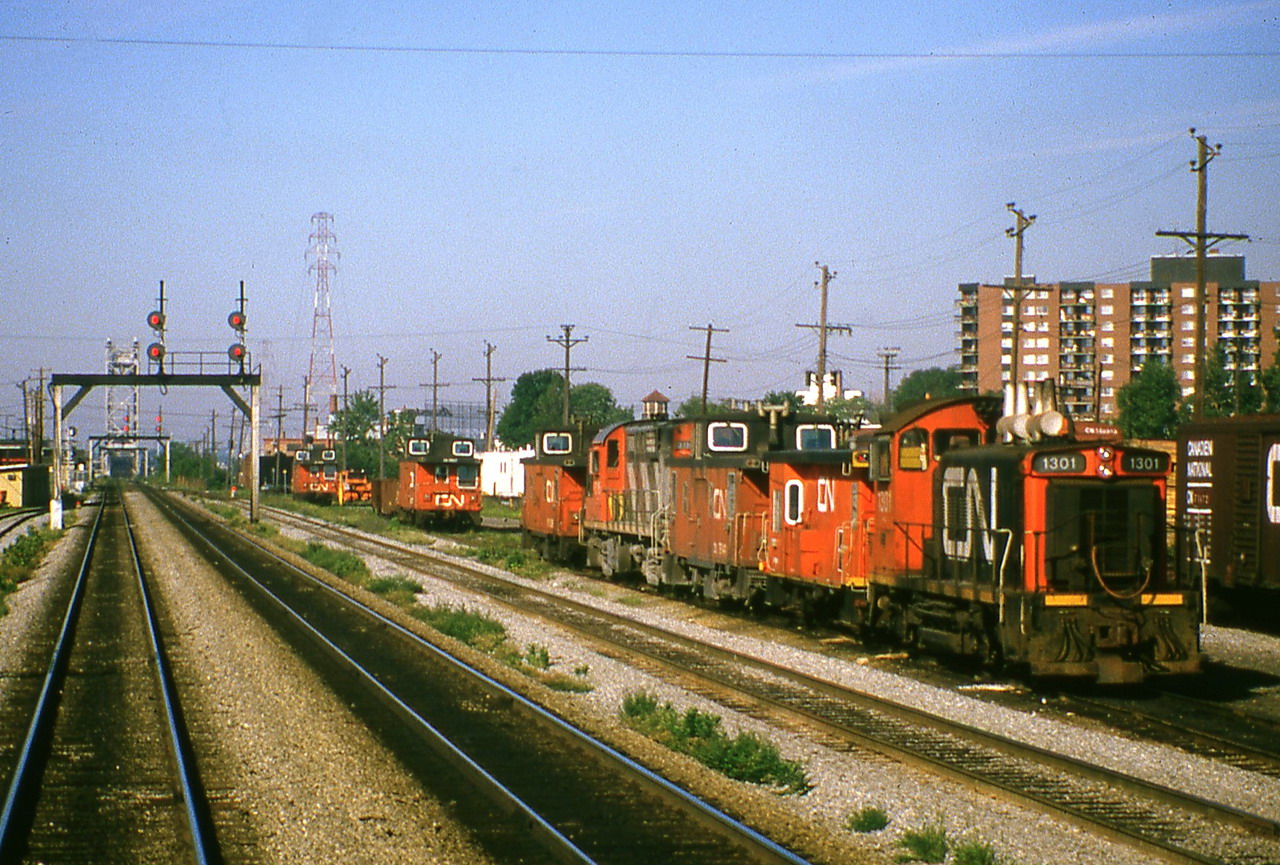 Caption: CN 1302 and 3743 and some vans at Southwalk yard.