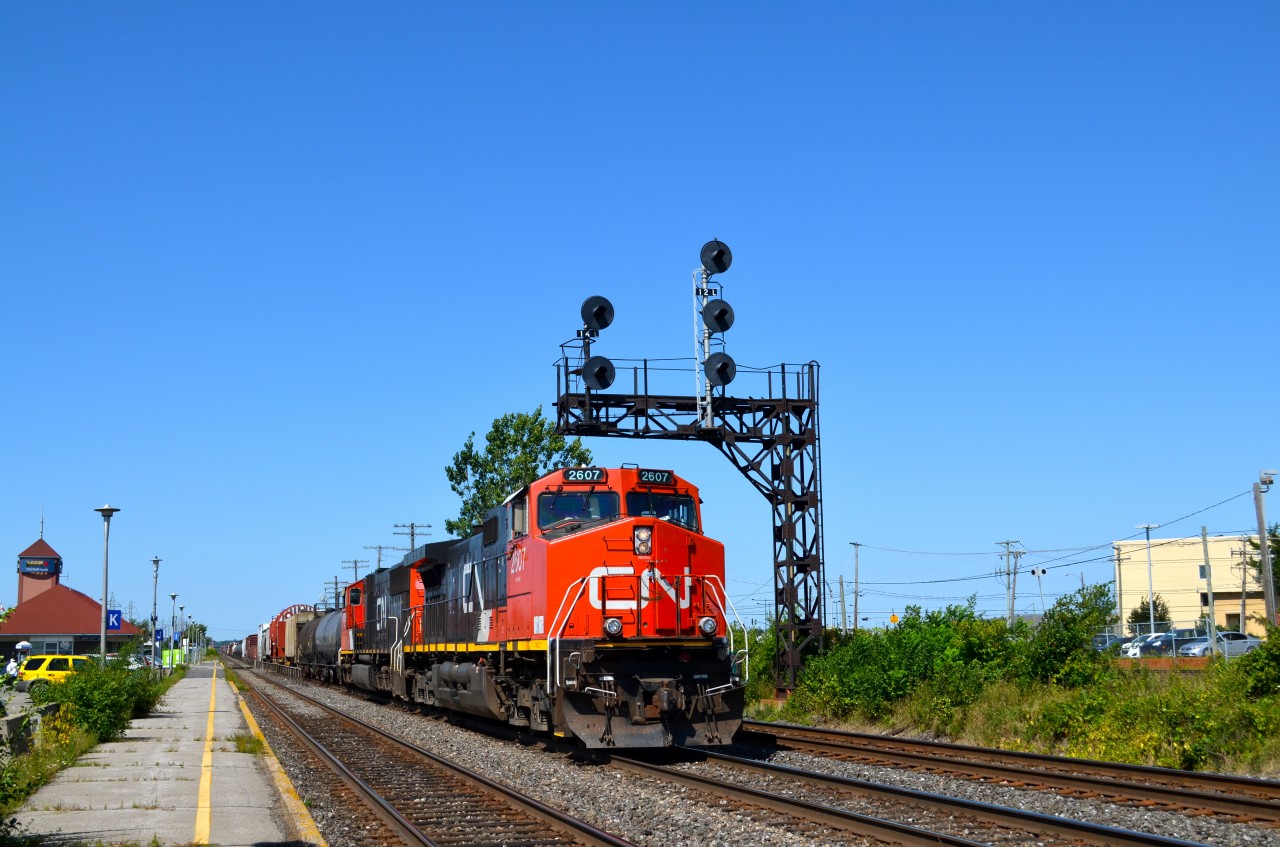 Caption: CN 2607 & CN 5629 head east past VIA's Dorval station with CN 368 in tow.