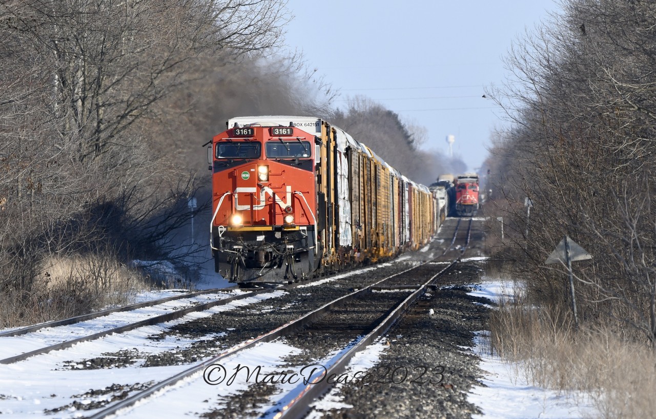 CN train 301 with CN 3161 in the lead overtakes train 385 at Stewardson Sideroad just east of Wanstead.