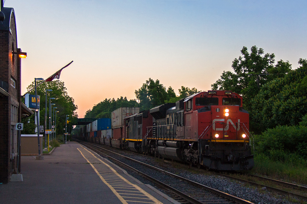 For power is CN 8804 and 2454. Used to hearing container trains on smooth track, hearing the sound of empty containers thrashing about on a bumpy south track was fairly intimidating. It certainly has a much more intense feel than the sound of what is essentially sheet metal on autoracks. A car count was not kept, but the train was around 200 cars. It felt odd seeing a complete stack train at the bottom of the Niagara Escarpment on the south side of Lake Ontario. I decided to be up really early, anticipating this might be the only chance to see this reroute in early morning light or even with any light at all, given this was the first run and future runs likely would be smoother. Was I ever wrong, and I'm glad. The first reroute of this train ended up being the earliest, and a few others came in decent afternoon light. Afternoon light would've required a different location however, and this was the only 122 to come before nasty backlighting set in, so making sure I shot this 122 here was well worth it.