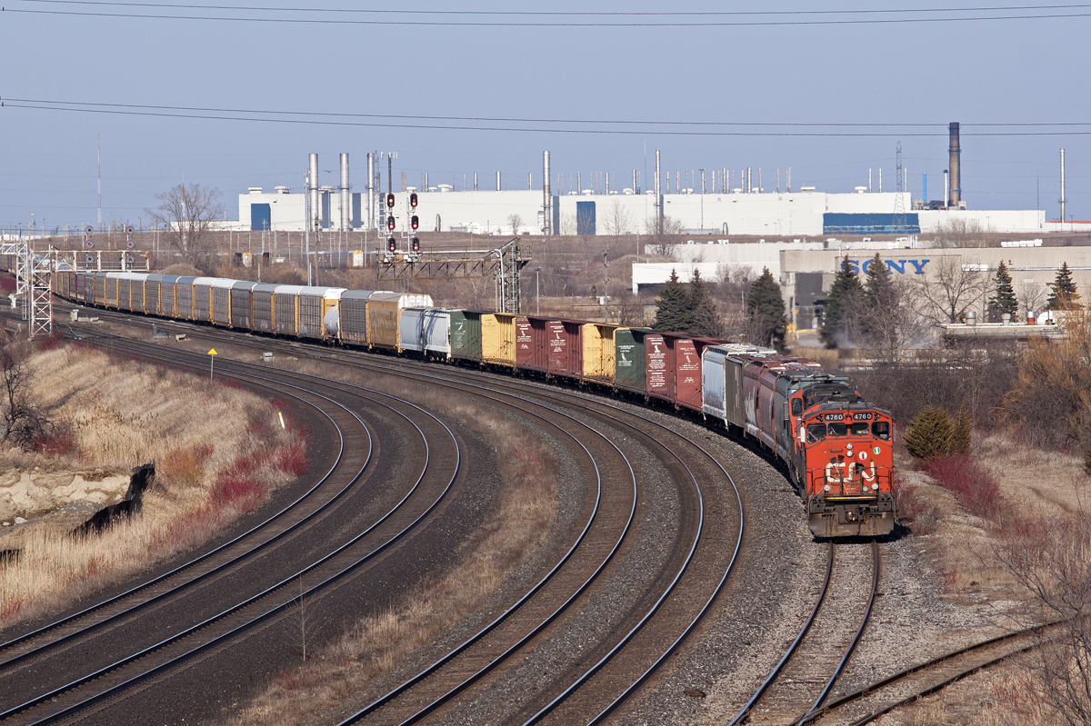 Caption: In response to Maxim Skorynin's photo of 570 departing Mac Yard, here's the same 570 departing Oshawa with 73 cars and 6700'.