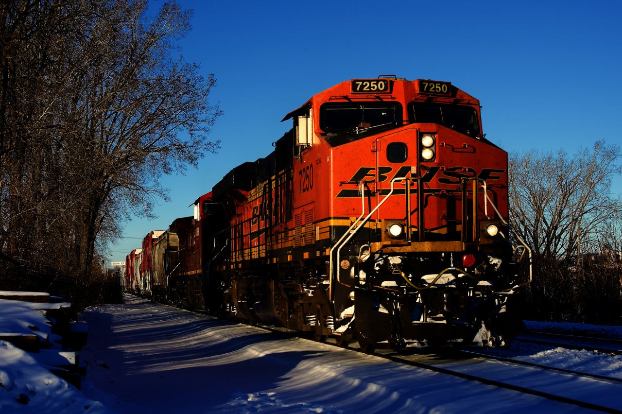 Caption: Normally leaving Montreal well before sunrise, a very late CPKC 228 is leaving mid-afternoon, with a BNSF leader.