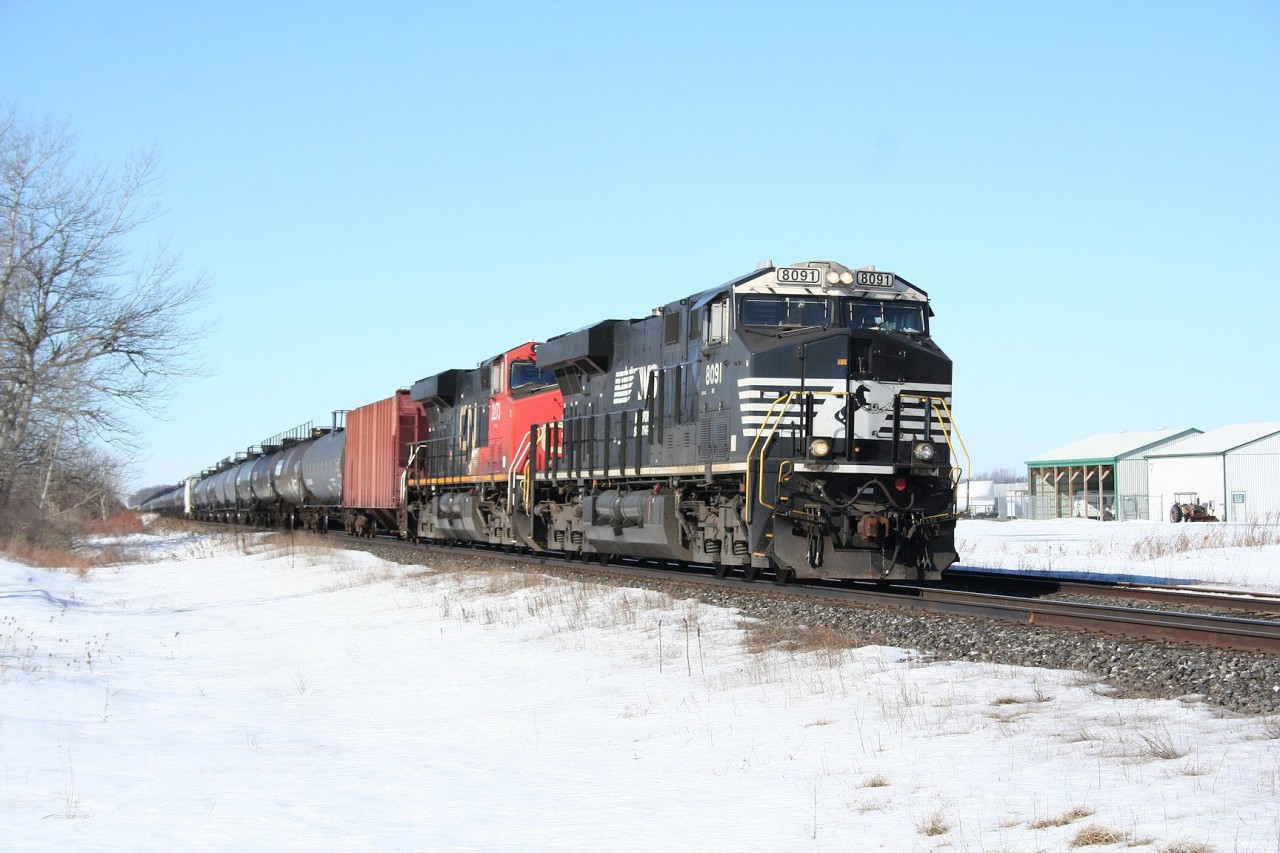 Caption: NS ES44AC 8091 leads a CN ES44DC, CN 2273, on the point of an extra 396 through the small village of Kerwood, Ontario.