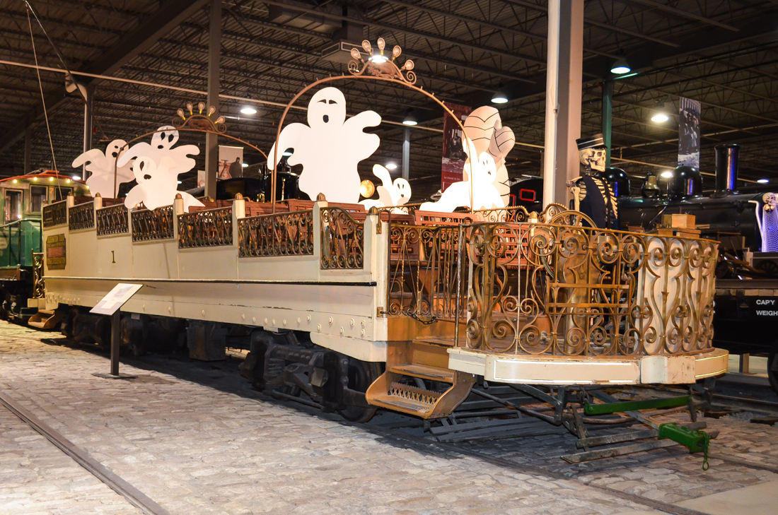 Caption: THAT'S the conductor?! MTC 1 (one of two open top 'Golden Chariot' streetcars in Exporail's collection) and a number of other exhibits at Exporail have been decorated for Halloween. For more train photos, check out http://www.flickr.com/photos/mtlwestrailfan/