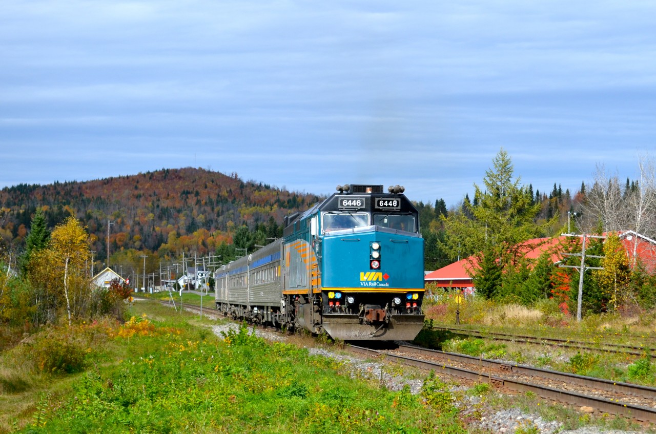Caption: VIA's train from Jonquière in northern Quebec has just made its station stop at Rivière-à-Pierre and is heading south again. The train consists of VIA 6446 followed by two stainless steel coaches and a baggage car. The power is turned at Jonquière on a turntable, but the cars are not turned, hence the baggage car at the rear end. For more train photos, check out http://www.flickr.com/photos/mtlwestrailfan/